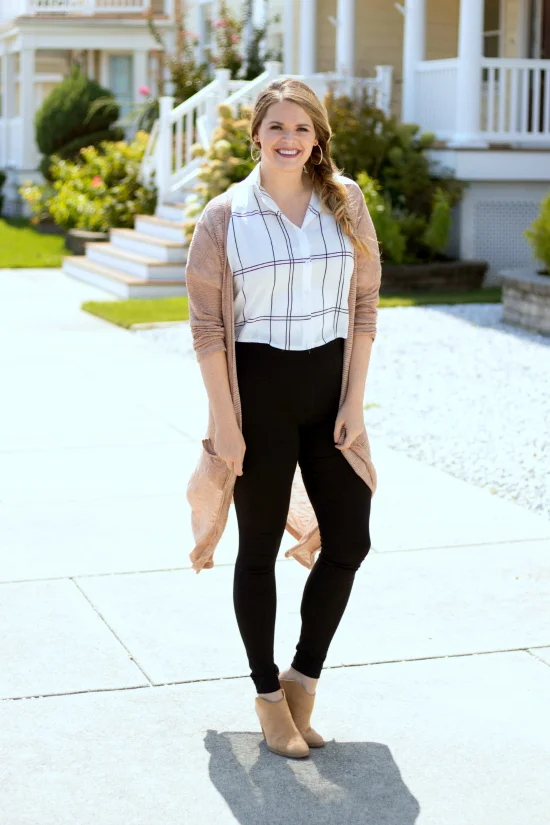I love this gridlocked crop top because it is great for high waisted anything or tucking into skirt. It also looks really cute tied. But for this look I paired it with my high waisted leggings, because I believe leggings are pants. And I matched my duster to my shoes to add in some great camel color. Hair in a braid, hoop earrings in, and LipSense on and I was good to go!